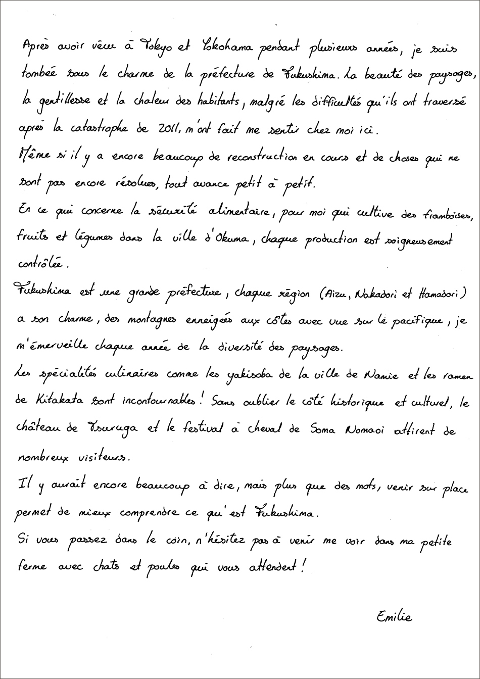 Она хотела обосноваться в районе, пострадавшем от ядерной катастрофы 2011 года, и внести свой вклад в восстановление региона. Серия случайных встреч в конечном итоге привела ее в Окуму, один из двух городов, где расположена закрытая атомная электростанция. Все началось с совета ее бывшего ученика родом из Фукусимы, а завершилось знакомством с фермером, родиной которого оказался город Окума. По словам Эмили, она благодарна каждой случайности в цепочке событий, которые привели ее сюда.