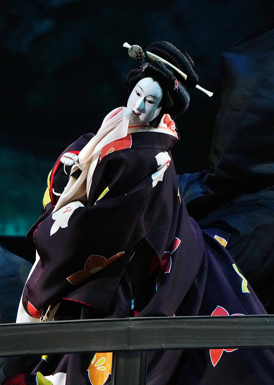 “‘Sonezaki’ is a play that portrays the tragic deaths of star-crossed lovers, performed with a unique beauty through puppetry. Such tragic love stories are common in bunraku, and one of its distinctive features is that, because the characters are not played by real people, the audience doesn’t experience death or bloodshed in a graphic way. Instead, they are able to focus more deeply on the emotional drama that leads the characters to their fate.”