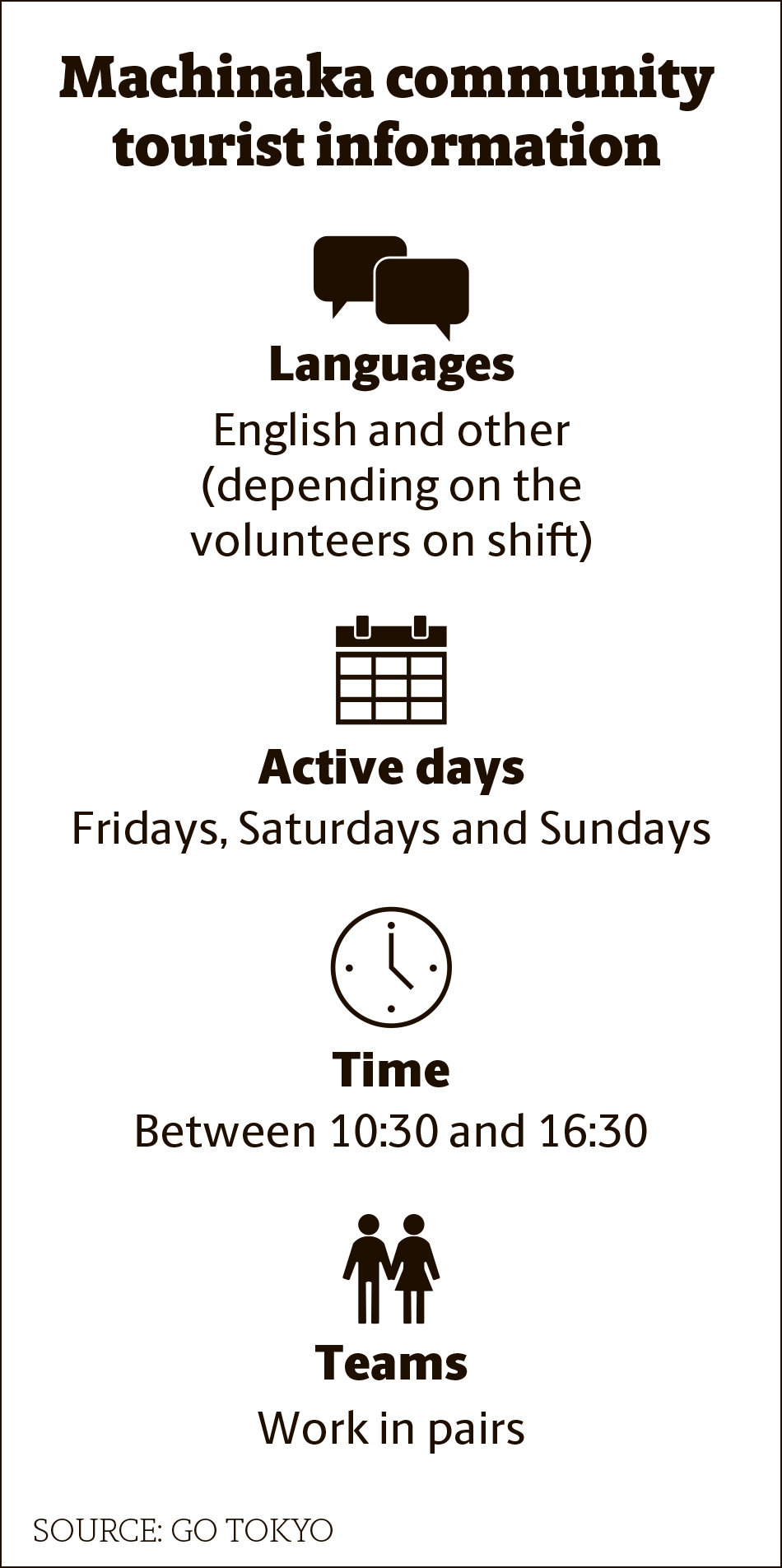 The key to finding machinaka community tourist information guides is to look for people in sky-blue checkered uniforms working in pairs. In addition to answering questions, the guides also actively approach foreigners who seem to be lost, in need of help or looking for something. The languages spoken vary, and guides wear a card around their necks listing the languages they speak.
