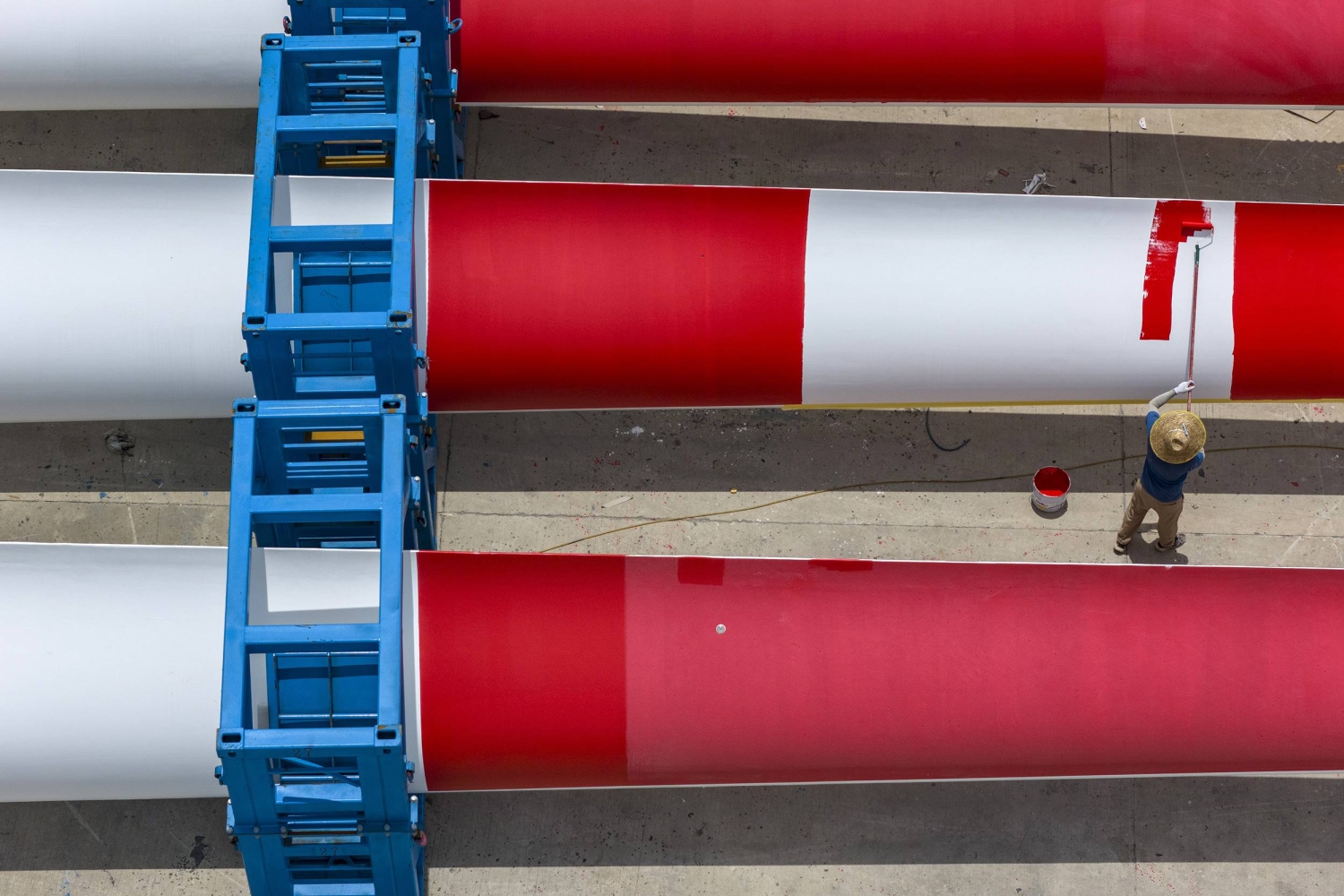 At one factory owned by Ming Yang in the fishing town of Yangjiang, 250 kilometers west of Hong Kong, the scale is evident. On an early August morning, dozens of workers walked across a curved platform resembling a giant surfboard more than 100 meters long, soon to be assembled into a wind turbine blade.
