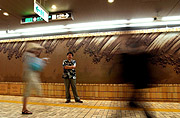 Embedded into the tiled wall at the entrance of Ushigome-Kagurazaka Station is what at first glance appears to be a beach. The 10-meter-long, 2-meter-high work resembles a stretch of genuine sand, its smooth, damp surface scuffed and scratched here and there, perhaps by an idle passerby.