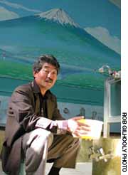 "Sometimes I am asked to paint something unusual -- a large ship, a Disney scene or something. But, if you ask me, Mount Fuji is the most suitable for Tokyo bathhouses," says Nakajima, known by children in his neighborhood as "Mr. Fuji-san." "Anything else looks out of place."