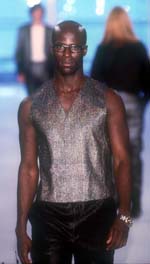 In among the fabrics derived from traditional processes, a new one on the runway in his Tokyo collection was a soft hemplike fabric derived from bamboo fibers. At the other end of the spectrum, Yamaji utilized techno-fabrics, which included an ultralightweight polyester used for umbrellas and a bonded fabric in which three layers are sandwiched together. This last fabric was used to perfection in a shiny black single-breasted jacket lined with a burgundy shell, which Yamaji paired with a translucent silk-and-polyester shirt in the same color as the lining.