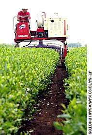 In the space of two hours, the machine can collect some 250 kg of leaves from one 800-sq.-meter section of the tea field. The fresh crop is processed in Kato's factory the same afternoon. There, machines sterilize the leaves with steam to prevent oxidation, roll them to liberate the juices and enzymes sealed within, and then dry them with warm air. By nightfall, the leaves have been processed into needle-shaped green tea, just one-fifth of their original weight.