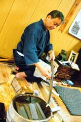 At this point the sword is passed onto a polisher. Depending on the sword, the polisher usually spends about eight days on one blade. With a new one, the time is evenly split between relatively rough polishing, using stones slightly larger than a video cassette, and the final polishing, which includes the use of paper-thin stones glued onto a special kind of washi paper.