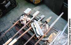 Yoshihara says the most difficult part of making a sword is reworking and tempering the special steel he buys that is made in a tatara (Japanese-style smelter). Steel, an alloy, is formed in the smelter by heating iron-oxide sand, or iron ore, so that it naturally combines with the carbon released from burning charcoal.