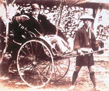 Nicholas, and his cousin Prince George of Greece, arrived in Nagasaki on April 27 aboard the warship Pamiat Azova. For the next three weeks, the young men enjoyed official duties, such as banquets, exhibitions of Japanese arts and crafts, and displays of traditional martial skill such as horseback archery. Included in the current exhibition are photographs of the Tsarevich riding in a rickshaw and enjoying the view from one of the Western-style houses provided for their accommodation.