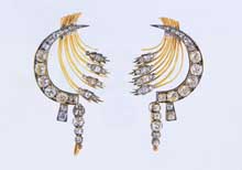 The Romanovs' time came too, of course, that night in Ekaterinberg, and in 1923 the Soviet hammer-and-sickle flag was hoisted over Russia. It gives a retrospective irony to one of the most attractive jewelry items in this exhibition, the treasure of a Romanov princess: a pair of earrings studded with diamonds -- in the shape of the Soviet sickle.