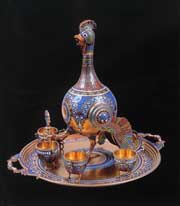 With the consolidation of Romanov power, however, and the spread of intellectual progressivism for which Russia became famous, imperial patronage of craftsmen took an increasingly secular turn. There are stunning, heavy gold- and silverware pieces here, dating from the 18th century. The 19th century saw a vogue for bright enamel ornamentation, and the ateliers of Moscow and St. Petersburg turned out luxurious items intended for everyday use, such a lapiz-colored ink-stand and a rooster-shaped decanter with eggshell-shape goblets standing on golden legs.