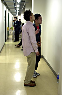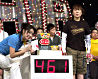 Among their rivals was another manzai team called Non Style, who had already won twice since their first appearance earlier this year. "Unlike other TV competitions where the judges are professionals, what's important here is to make the audience in front of us laugh, so it's easier for me to do," said Yusuke Inoue, 25, the tsukkomi half of this Osaka duo. "And it's a big deal to be aired nationwide. My grandmother in Tottori Prefecture can watch what I'm doing, too," said Inoue with a grin. Soon, he and his boke partner Akira Ishii, 25, were back to practicing in the corridor, performing for an imaginary audience on the wall.