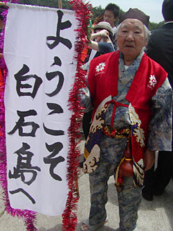 "So what are you two up to tonight?" I ask, knowing that since they are all dressed up in red Hawaiian shirts they must be up to something. "We are busy promoting the island," Man-chan says. "This afternoon we met the ferry and waved a welcome banner as the tourists got off the boat."