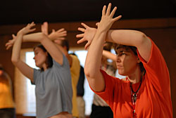 Today's first workshop is in the martial art of Waraku. Instructor Maeda Hiramasa, a former Olympic-class karate expert, introduces the ancient sword-based Shinto martial art. After an impressive demonstration of the "eight basic spiral motions" and the "Shinto primal sounds," he details the philosophy behind Waraku.