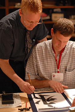 When teachers return after lunch they find long tables laid out with paper, brushes and inkstones ready for the calligraphy class. First they are taught how to write the Chinese character for "eternity." It's the character that all students of calligraphy have practiced for generations because it uses all five of the basic brush strokes. After that they are invited to draw a character of their choosing; instructor and assistants brush examples for them to copy. David Hruskoci, from Shrewsbury High School in Massachusetts, picks the characters that mean "science" (the subject he teaches).