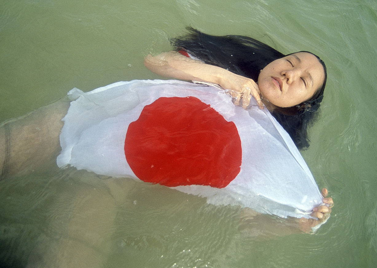 In order to explore such contradictory attitudes toward Japan, between 1993 and 2011, Ishikawa handed out Japanese flags to people across the length and breadth of the nation — as well as in Europe, Taiwan and South Korea — and asked them to show her what they thought of it. The resulting 184 photographs, 42 of which make up the show, are full of the darkness, eroticism and humor so characteristic of all Ishikawa's photography. Rightwing toughs stand beneath a framed flag in the cramped foyer of their Tokyo office. An expat Japanese woman pins a tiny flag to a map of Japan she's molded from steamed rice on her kitchen table in London. A young Korean man punts a Hinomaru-wrapped football toward the camera.