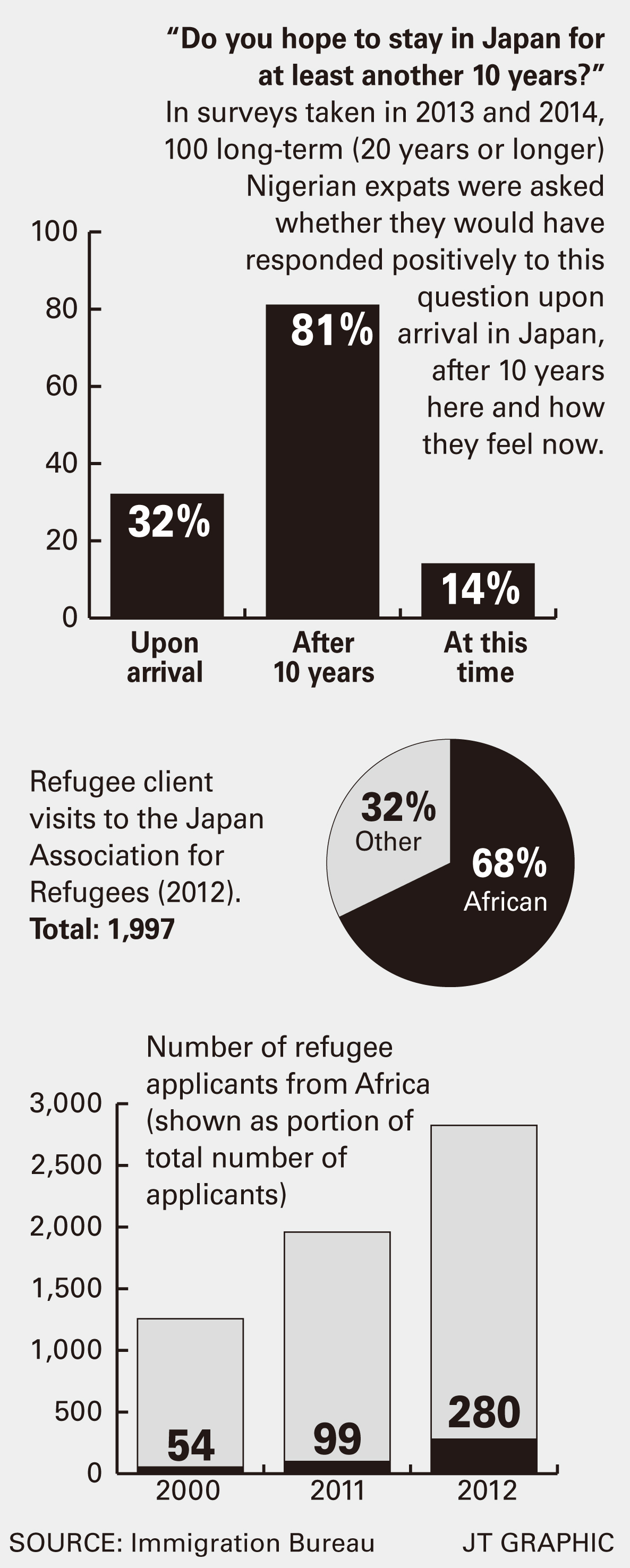 "No incentives," he said. "If you learn Japanese — which is the first thing you must do — you are still an African in Japan. You apply for jobs and they tell you, 'Nihongo jōzu!' ['Your Japanese is excellent!'] but you don't get the job."