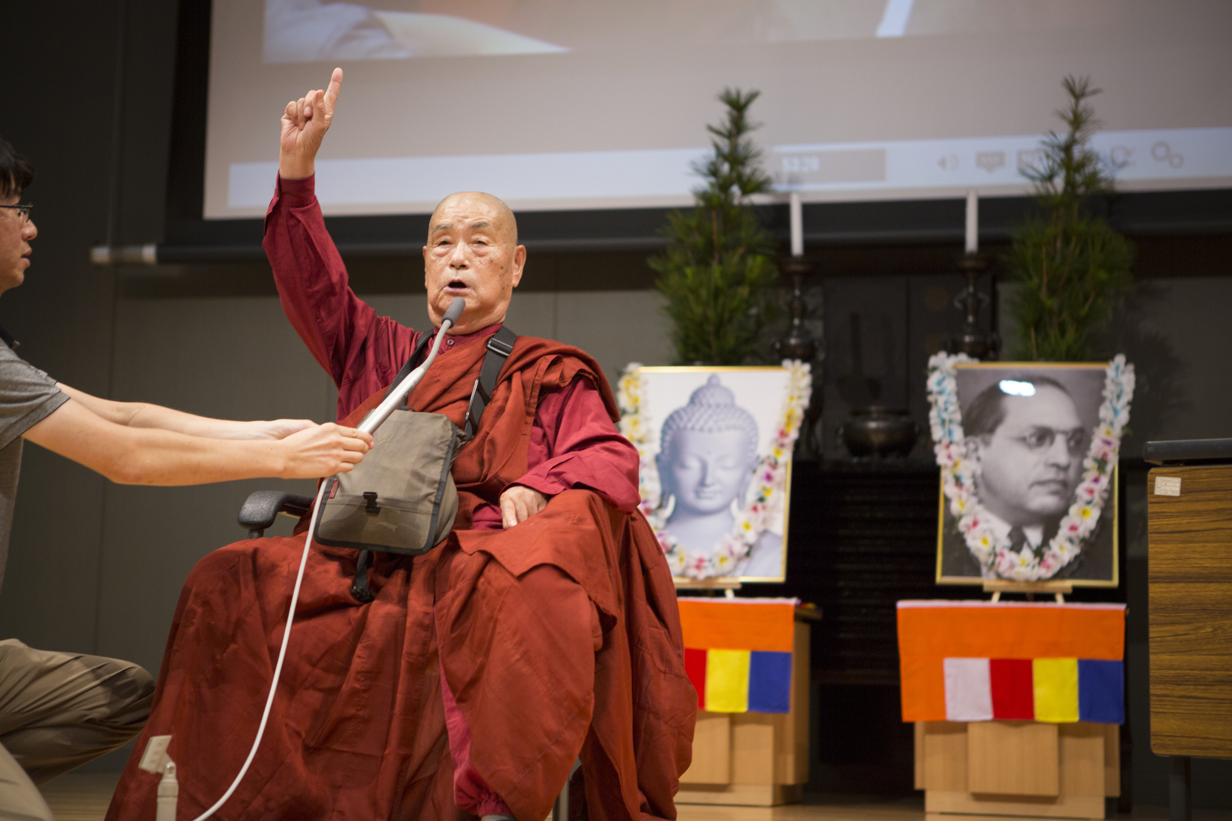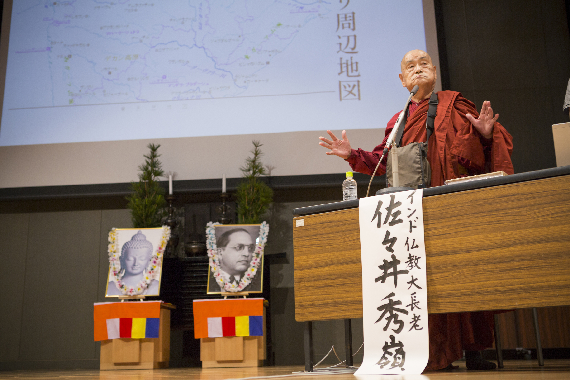 In a Kobayashi film from 2009, we see Sasai on stage back in India, speaking to hundreds of Indians in orange robes, preparing them for a mass conversion to Buddhism.