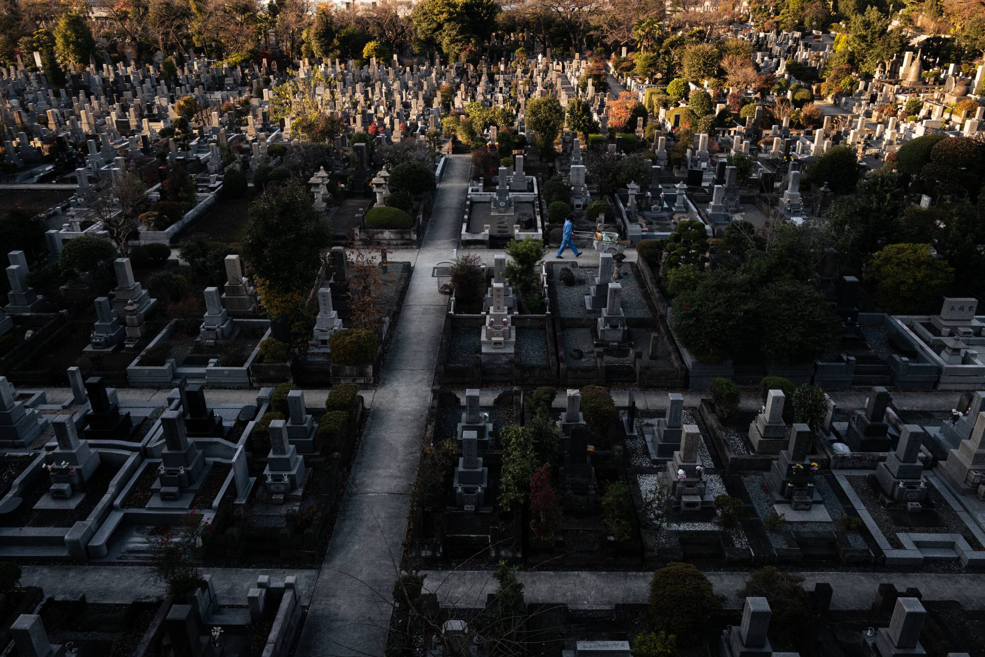 The American tendency to avoid the topic of death now felt lacking compared to the rituals I witnessed in Italy and Japan. I felt a sort of envy of those who had been raised with more prescriptive ways of dealing with loss. Mortality was in my thoughts, and I found myself drawn to death and mourning as subjects. On a pedestrian overpass somewhere in Setagaya Ward, Tokyo, I saw light falling on the graves in the back of this cemetery and stopped to shoot a picture or two. I stood there watching light illuminate headstones before noticing there was a man tending to the graves. He loaded up his tools and trundled his cart along the cemetery path, and I took this photo. So many lives, I thought, people with families and forgotten stories, all resting quietly beneath his feet. LANCE HENDERSTEIN