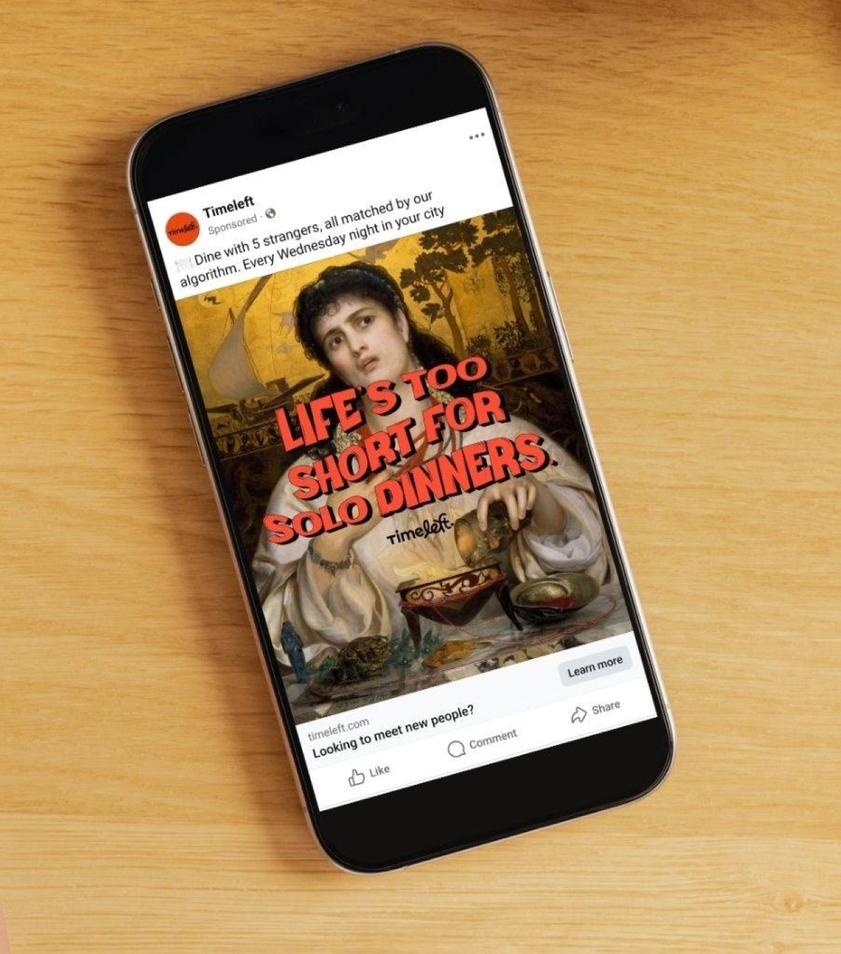 How did I find myself at a dinner with complete strangers? Well, a few weeks earlier, my social media feeds became flooded with ads for an app called Timeleft, pushing slogans such as “Life’s too short for solo dinners” and “Find your tribe,” and reinforced by photos of gleeful stock models clearly having the best night ever.