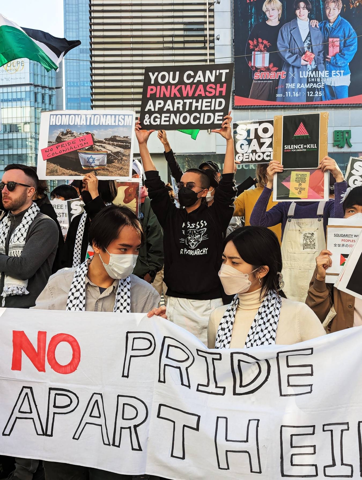 From street level, Namnam Space is easy to miss, tucked away in the backstreets of Koenji Junjo Shotengai, with only a flyer directing visitors up to its fourth-floor door. The door itself — framed in pink and emblazoned with a large sticker of a Palestinian flag — is not as easy to miss. Political stickers and event posters for local stores stretch across the neighboring walls, melding into a faded background of agitprop from past campaigns.