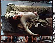 In "Soliloquy I," a formal study, Taylor-Wood uses an actor to re-create, in a contemporary context, a painting called "The Death of Chatterton" by the 19th-century British artist Henry Wallis. A strip underneath the main image contains the 360-degree photographs that Taylor-Wood used in her well-received, mid-1990s series "Five Revolutionary Seconds." Here, the parallel images work to bring an atmosphere that is open to interpretation -- could the man be not dying but rather dreaming the scene below? This the viewer is left to decide.
