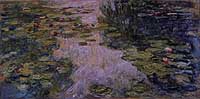 Perhaps, too, this image expresses Monet's pantheistic perspective -- he idealized the harmony of nature and identified God with the universe -- and like many people at the time, the artist was attracted to notions of pantheology, which sought to synthesize all religions. Certainly the later works are stronger and darker, seeming to contain sadness in the depth of the water, but expressing an optimism in the way the whole reflects the complexity and beauty of everything below, around and above.