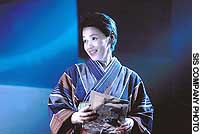 Though Takamura's poems were all dedicated to Chieko -- played superbly by Shinobu Otake, the ex-wife of TV celebrity Sanma, and once romantically involved with Noda himself -- in this play Noda reverses the roles, telling the story of Chieko's life through her eyes, not his words of adoration. The poet appears as a symbolic figure, played by violinist Tsuyoshi Watanabe, who speaks not one word but uses music to express feelings.