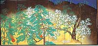 The resulting screen paintings from the 1920s and '30s are certainly lively and colorful, and Jun Shioya, from the National Research Institute for Cultural Properties, thinks they reflect Yokoyama's most creative years. For example, he says, the pair of screens from 1918 depicting the tea master Sen no Rikyu as a child, "does not make the usual connection with the tea ceremony's world of wabi [extreme simplicity]." Instead, it shows a youth amid vibrant greenery, "almost like a jungle." There is just one golden-russet tree, which refers to a story about the sensitive lad who was one day told to sweep his teacher's garden. He did so, carefully brushing up every leaf. Then, feeling that something was missing, he shook the tree so a few leaves would scatter and the autumn atmosphere would return.