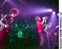 Which isn't to say sounds weren't available, only that those sounds were limited to MP3 recordings of songs from their European tours, with titles that seemed to change by the hour. The band's first EP wasn't on sale until three days prior to the Quattro show, which meant you couldn't find it at any local record stores. When you could dig up a description of the music itself, you read about influences as wide-ranging as Led Zeppelin, Fela Kuti and salsa; or that the band was an offshoot of a dub-electronica project called Defacto. In its press release, the Japan tour promoter likened their sound to prog-rock dinosaurs like Yes and King Crimson.