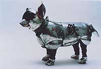 Koji Iijima, whose "Fake Aibo Tetsubo" (2000) is a real live Chihuahua clad in aluminum to resemble Sony's pet robot-dog Aibo, inverts our expectations about the relationship between quality of life and technology. As we look at this dog, imprisoned in a 0.5-mm sheath of armor that limits its movements, it appears that the depersonalization of life has sunk to a new low. No longer cute, like his robot twin, the "fake" Aibo suggests a grim future in which life as we know it is overwhelmed by technology.
