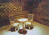 In another dig at the world of high-tech, "Mellow House" (1999) by artist Chelin is suffused with the smell of baked cookies, evoking nostalgia for the domestic happiness of childhood. The installation resembles a doll's house -- and also conjurs the fairy-tale image of a house of sweets, as in the story of Hansel and Gretel. The walls are covered with a mosaic of colorful cookies, baked by the artist, the floor is coated with granulated sugar and the room contains only empty chairs and a table.