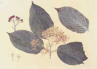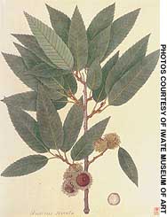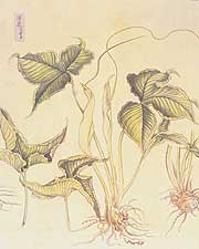 Mizutani Sukeroku (1779-1833), a Japanese scientist with no great artistic skill, fulfilled the botanical requirements very effectively by adopting the European "natural printing" technique, whereby an electric current was applied to an object to galvanize its image onto a metal printing plate. Mizutani made prints of leaves, which he supplemented with hand-drawn details of the flower- and fruit-bearing stages. His stark graphic images testify to the Japanese compositional sense -- and to the country's long tradition of printmaking.