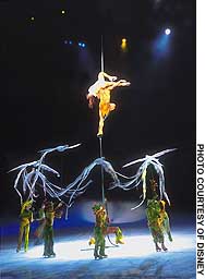 It's not all aerobatics. Some scenes are good ol' Disney song and dance, as when gorillas trash the camp of Jane and her father, finding as they do so all sorts of items that they use to create music, including a typewriter and tin cans. For this musical number, the animals do a rousing combination of hip-hop, stomp and acrobatics -- from back handsprings to jumping onto a chair on a 3.5-meter stick held high by another gorilla (all of them on skates, of course).