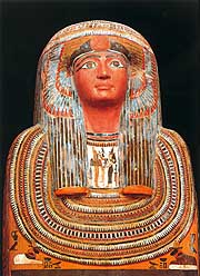 Death masks, like that of Tutankhamen, were placed over the mummy. Sarcophagi were decorated with an anthropomorphic design, such as that adorning the centerpiece of this exhibition, the exquisite and colorful inner sarcophagus (c. 800 B.C.) of a New Kingdom-era temple functionary named Penju. The depiction of the human face supposedly helped a wandering soul to identify its own body. "May [the soul] gaze upon its earthly body; may it take up its abode," says the "Book of the Dead."