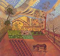 This emphasis on the integrity of even the smallest elements is evident in "Vegetable Garden and Donkey" (1918) and "House With Palm Tree" (1918), in which Miro paints each tiny blade of grass and flower petal with a naive charm reminiscent of the paintings of Henri Rousseau.
