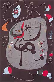 The results of this evolution can be seen in "Women, Bird, Stars" (1942) and "Dancer Listening to the Organ in a Gothic Cathedral" (1945). With their anthropomorphized, hieroglyphic shapes, childlike freedom of line and exuberant color, they already contain all the elements that would later come to typify Miro to the world -- and provide Spain with the perfect graffiti to blot out the Franco years.