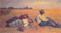 Other works tread a finer line. Jacque-Eugene Feyen's undated "Rest after Harvest" at first seems to be another idyllic canvas, showing peasants at rest in a field of golden wheat. After appreciating the scenery, the viewer is shocked when, focusing on the faces of the three figures, it becomes clear that they are completely exhausted, utterly unable to share our delight in the beautiful rustic scene.