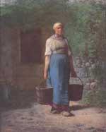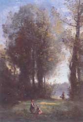 Also, like the Impressionists, they rejected the mythological and heroic subjects of the academic style in favor of representing reality. This can be seen in Millet's "Woman Returning from the Well" (1855-60), a frank depiction of a pregnant woman heavily-laden with two full buckets of water -- the feeling that she is posing for the artist seeming to make her burden all the more palpable. The impressionistic softness with which Millet paints the face conveys the subject's evident dull tiredness. Corot, too, uses light brushstrokes in works such as his idyllic landscapes, "Women Picking Daisies" (1865-70) and "Children Gathering Nest" (1872-3).