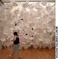 Kikauka's "M.A.N.I.A.C. (Marvelous Abundant Neglected Items Arranged Creatively)" art is represented here by "Camp Cornucopia: Someone Else's Vacation," which is, basically, a two-person tent totally encrusted with assemblages of interesting junk. The strains of ersatz exotica music waft from a portable sound system inside.