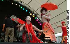 Next morning I'm woken up by reggae coming from somewhere. A perfect start. After grabbing some lush curry-rice, which just about everyone is rabidly devouring, Dave heads off on a 40-minute cigarette run to a store while I kick back and enjoy The Sideburns, who play brilliant old-school ska with no vocals. The sun is shining, a refreshing breeze is blowing in from Mount Fuji and virtually everyone on-site -- several thousand -- is in the mosh pit. I'm so blissed-out on the hillock that I'm unaware the screams from below are for mad jazz ensemble Shibusa Shirazu and the equally deranged butoh dancers stalking the stage.