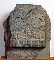 The symbolic motifs used to represent the Buddha are numerous -- the Bodhi tree under which he discovered the true meaning of life; the lotus throne; and the dharma wheel, symbolizing, among other things, the cycle of birth and rebirth. Showing here is a beautiful example of a popular Buddha-symbol, the third-century A.D. "Buddhapada (Buddha's Footprint)" from the remarkable temple complex of Nagarjunakonda in southern India, where Buddhism had spread under the last great emperor of the Mauryan Dynasty, King Ashoka (reigned ca. 273-232 B.C.).