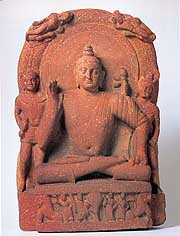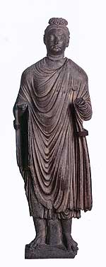 The turning point in Buddhist art came a few centuries later, during the era of the Kushan Dynasty (late first century-third century A.D.), whose domain stretched from central Asia to northern India. Something -- although this exhibit doesn't venture any explanations as to what -- triggered a departure from the symbolism of early Buddhist art to the first examples of figural representation. The shift occurred, incidentally, around the same time that the concept of bhakti was gaining ground. Bhakti -- stressing the intense emotional attachment of a devotee to his personal god as a means of achieving salvation -- may have pushed Buddhist art toward developing an approachable image of the Buddha.