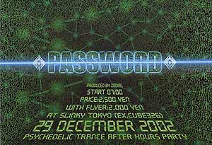Password after-hours party, by Zodiac, at Slinky Tokyo in Shibaura Ward. DJs Ziki (True Trance), Kemal (Zodiac), S7E7V7E7N (Historia/Zodiac) and YSK (Cosmic). Starts at 7 a.m. Ziki, Kemal and Seven are especially good morning DJs.