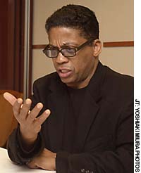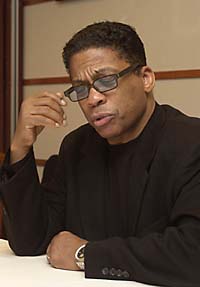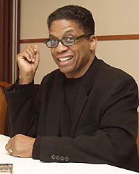 The fit, nattily dressed 63-year-old keyboardist frequently broke into a childlike grin as he openly discussed his formative experiences with Miles Davis, some of the crucial decisions he's made throughout his career, his embrace of Soka Gakkai International and his ever-present fascination with technology. Throughout the 40-minute interview, Hancock often paused for long intervals before answering a question and, at times, would trace patterns on the table in front of him, externalizing his thoughts before finding the language to express them.