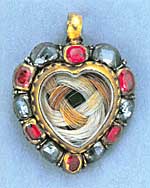 Vanity, though, gained the upper hand as Europe prospered. Memento mori lingered, but often in extravagantly sentimental form, such as two keepsakes from the late 17th century displayed here -- a heart-shape diamond-and-ruby pendant enclosing braided hair, and a 16-part necklace, each part an individual crystal locket initialed in gold and holding strands of hair.