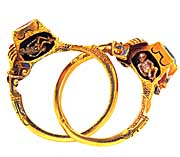 In that era, when life expectancy was in the mid-30s, death shadowed even life's happiest moments. One of the most striking exhibits is a gimmel ring. Made of conjoined hoops (the name is derived from the Latin gemellus, meaning twin), such rings were often given at marriage, but the 16th-century example here divides to show two cavities under the stone setting, each containing a miniature memento mori -- one a baby, the other a skeleton. We come into the world naked, the message seems to be, and we leave it with nothing. All else is vanity.