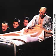 The acting, too, is intentionally stylized and almost robotic, as the play develops through absurdist but cutting dialogue between the two male characters, the bed-bound victim's wife (Mari Nakayama) and various doctors and nurses. There are, too, six black-clad actors who appear from the darkness like shadowy messengers from the subconscious to give voice to the uncle's inner self: his suppressed rage, frustration, self-doubt and despair.