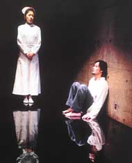 As a dim light begins to penetrate the theater's total blackness, we see on stage a young man (Gentaro Shimofusa) squatting by a wall and questioning aloud the value of his existence. Then his uncle (Tsunekazu Inokuma) enters and the young man's universal inquiries are addressed in a seemingly quite different way by this strong-minded, eccentric atomic-bomb victim.