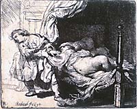 In many of the prints showing here, in fact, the earthy touches are almost shocking. In the foreground of "The Good Samaritan" (1633), a dog squats with its its back curved, captured in the act of excreting a steaming turd. More grotesque is the figure of Potiphar's wife, the lustful Egyptian who attempted to seduce Joseph, the son of Jacob, in a print showing the desperate woman lunging for the pure young boy. Her nightshirt has ridden up revealing her naked pudendum, massively oversized in the manner of Japanese shunga (pornographic woodblock prints).