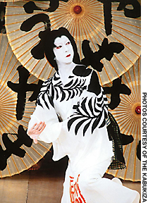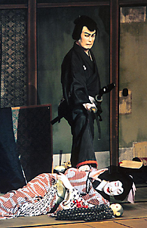 The action unfolds in downtown Edo (instead of Osaka, as in the bunraku play) and features exciting miseba (highlights), punctuated with no less than 30 hayagawari (quick costume changes onstage).