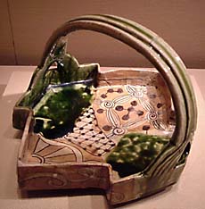 The Oribe exhibition is about how different artistic genres and foreign cultural influences met and meshed together to create the style we know as Oribe. Such pottery is characterized by its asymmetrical forms, lively designs and whimsical charm. Odd, then, that it was born out of the somber mood of wabi tea ware that emphasized symmetrical forms, such as Raku tea bowls, and more somber color schemes.
